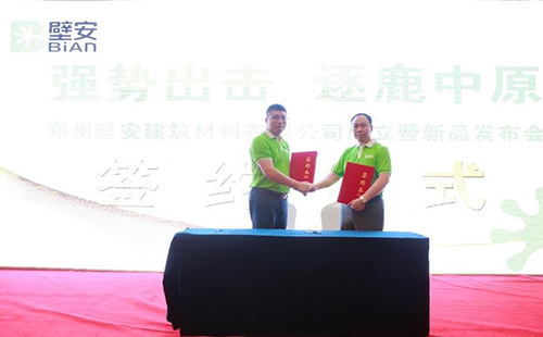 东方77体育民建公司副总司理熊卫锋先生为大会致辞,他体现,依附东方77体育的优质产品服务,立异创客模式,壁安品牌生长远景重大。民建公司壁安粘合剂事业部总司理陈明先生向在场嘉宾叙述了壁安品牌的由来及其战略妄想,“相信创客,深度分享;相信合作,周全赋能”是壁安平台给与合作伙伴的允许与希冀。随后,陈明先生代表壁安品牌与郑州壁安修建质料有限公司董事长张万祥先生现场签约,告竣战略合作协议。