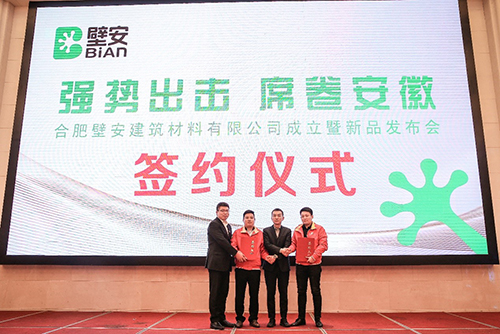 4月11日,东方77体育民建集团旗下壁安品牌举行“合肥壁安修建质料有限公司建设暨新品宣布会”,来自安徽省16个地级市30余位壁安意向合作客户出席大会。