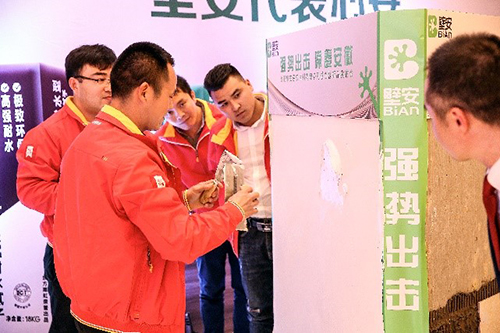 民建公司高级产品司理潘佳对壁清静品类产品做详细先容。大会共宣布壁顺产品21种,涵盖瓷砖胶、腻子粉、界面剂、堵漏宝、填缝剂、防水等品类。为更好地展示产品性能,合肥外地着名瓦工杜师傅和意向客户现场对部分产品举行试刷,并约请与会嘉宾上台感受产品的施工体验。
