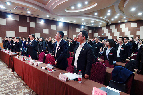2月18日上午,在国歌和司歌的合唱声中,虹运基辅材供应链管理有限公司2018年岁情总结暨2019年岁情安排聚会正式召开。