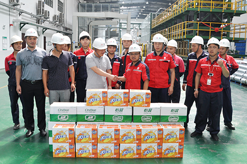 7月31日 ,江苏省新沂市开发区管委会一行开展“进企业 ,送清凉” 运动 ,慰问仍坚持斗争在一线的徐州卧牛山员工。