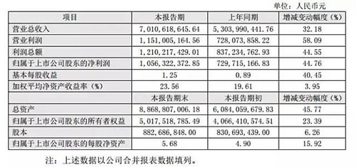 二、谋划业绩和财务状态情形说明 报告期内,公司实现营业总收入7,010,618,645.64元,较上年同期增添 32.18%,主要系随着公司品牌影响力一直提升,产品销量同比增添,质料销售业 务和施工服务营业规模均有所增添所致;营业利润1,151,005,164.56元,较上年 同期增添58.09%,利润总额1,210,217,429.01元,较上年同期增添44.55%,归属 于上市公司股东的净利润1,056,322,372.85元,较上年同期增添44.76%,基本每 股收益1.25元,较上年同期增添40.45%,主要缘故原由是报告期公司营业状态整体向 好,主要产品的销售收入、施工收入继续增添,毛利润逐步提高所致。 报 告 期 公 司 财 务 状 况 良 好 , 截 止 2016 年 12 月 31 日 , 公 司 总 资 产 8,868,807,006.18元,较本报告期初增添了45.77%,主要是公司谋划规模扩大所致。