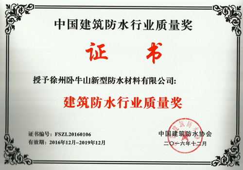 徐州卧牛山荣获“修建防水行业质量奖”