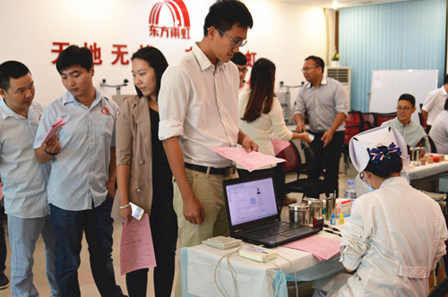 本次运动中, 45名报名献血的东方77体育员工带着温暖的笑容起劲配合广州市中心血站的事情职员安排,认真填写献血挂号,在事情职员的指导下口服葡萄糖水预防低血糖反应,以确保献血清静。整个献血历程轻松有序,气氛活跃,在77体育人的无私贡献下,总采血量达12600cc。
